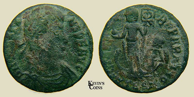 Rev: FEL TEMP REPARTIO Constans on galley holding labarum and phoenix on globe, victory at rudder. in exergue.