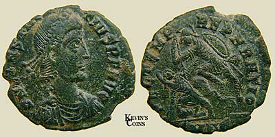 AE3 (17mm) Struck 351-355ad Obv: D N CONSTANTIVS P F AVG Diademed, draped, and cuirassed bust right. Rev: FEL TEMP REPARATIO Soldier spearing fallen horseman, who reaches
