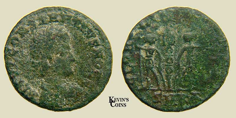 Rev: GLORIA EXERCITVS Two soldiers on either side of one standard. in exergue.