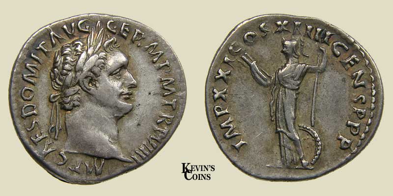 AR Denarius (19mm, 3.39g) Struck A.D. 89.in Rome Obv: IMP CAES DOMIT AVG GERM P M TR P VIIII Laureate head right |