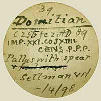 Rev: IMP XXI COS XIIII CENS P P P Minerva standing left, holding thunderbolt and spear, at her feet, a shield RIC-II 145 Ex William C Boyd (1840-1906) Collection, Baldwins Auction (42) 9/26/2005, Purchased by Mr. Boyd from "Seltman" (C.T. Seltman (1868-1952) of Cambridge Univ.. academic author and ocassional coin dealer) in April 1898 |