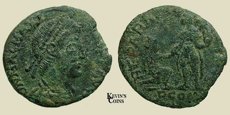 Rev: REPARATIO REIPVB Emperor standing, facing, head l, with rt hand raising a kneeling turreted female, and holding Victory on globe in left. PCON in exergue RIX IV 26a |