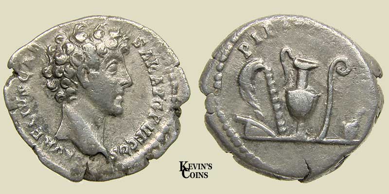Rev:PIETAS AVG Knife, sprinkler, ewer, lituus, and simpulum (priestly implements)