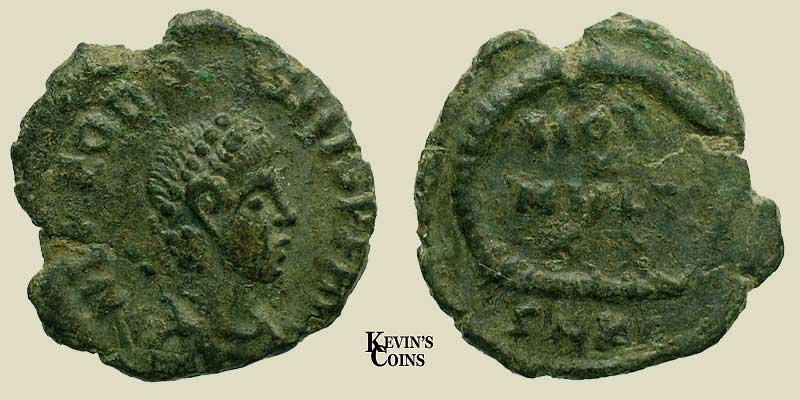 Obv: D N THEODOSIVS P F AVG Diademed, draped, and cuirassed bust right