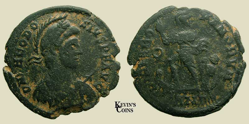 AE 2 (24m, 5.13g) Struck 378-383 A.D. Nicomedia Obv: D N THEODOSIVS P F AVG Helmeted (with pearl diadem) draped and cuirassed holding spear and sheild in front |