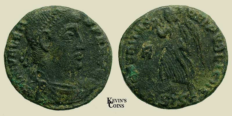 Obv: D N VALENS P F AVG Diademed, draped, and cuirassed bust right