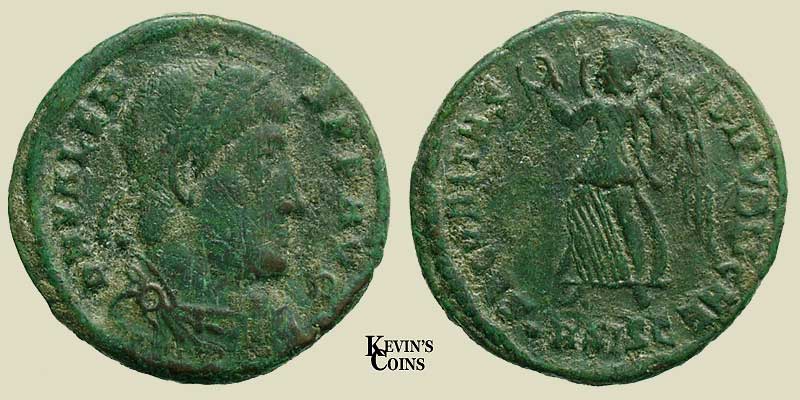 Obv: D N VALENS P F AVG Diademed, draped, and cuirassed bust right