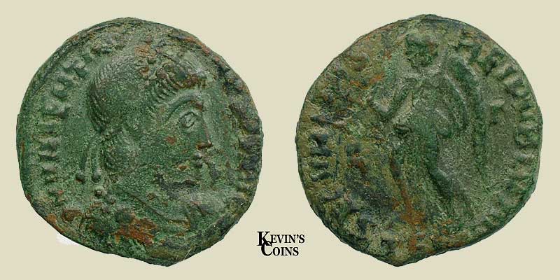 AE 3 (17mm, 2.48g) Struck 367-375 A.D. Thessalonica Obv: D N VALENTINANVS P F AVG Pearl diademed, draped, and cuirassed bust right |