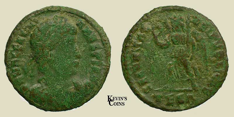 Obv: D N VALENTINANVS P F AVG Pearl diademed, draped, and cuirassed bust right